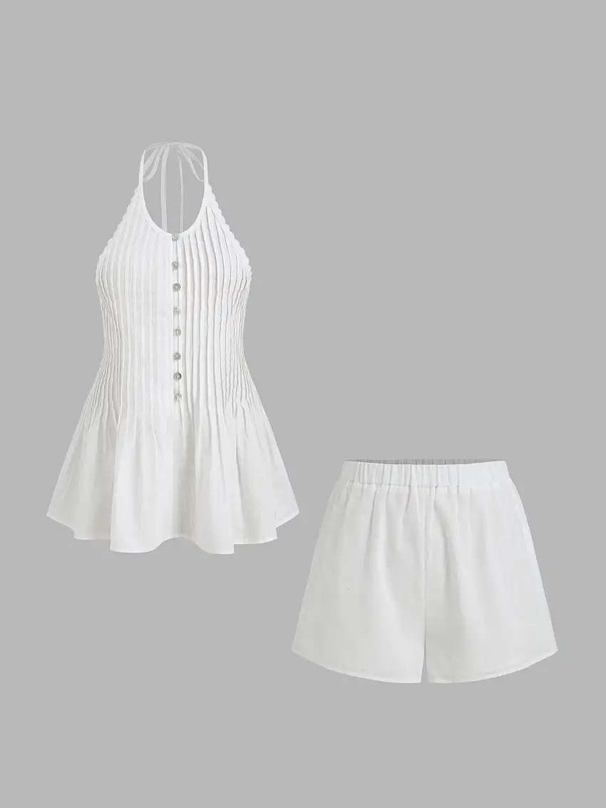 • 100% Cotton Halter Neckline Pleated Ruffle Top & Mid Rise Elastic Waist Shorts Set