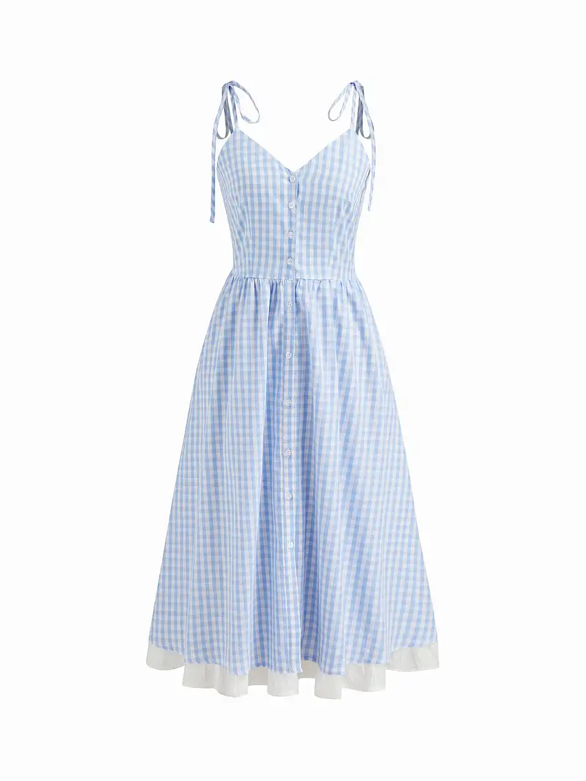 • 100% Cotton Gingham V-neck Knotted Cami Midi Dress