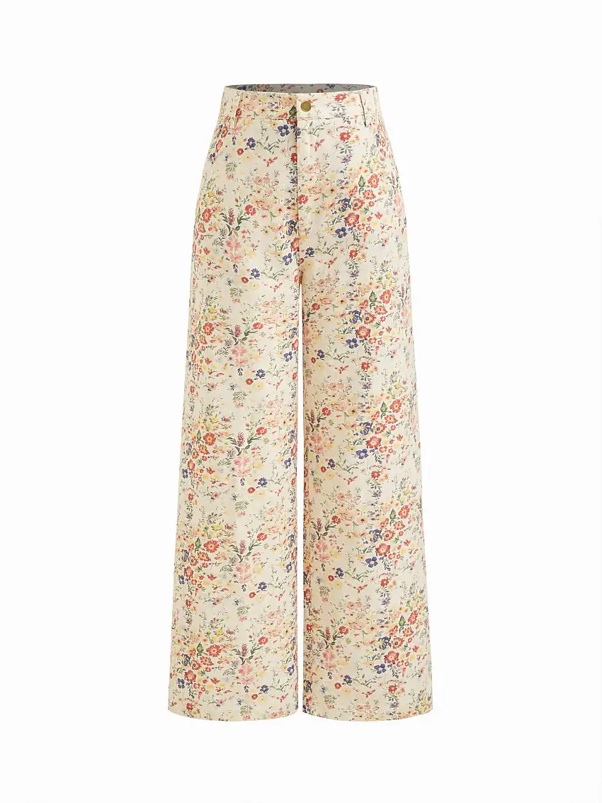 100% Cotton Floral High Rise Straight Leg Trousers