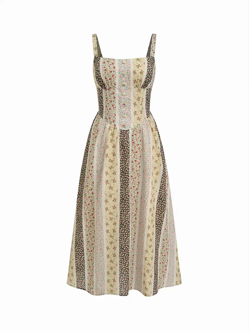 100% Cotton Floral Colorblock Lace Up A-line Maxi Cami Dress