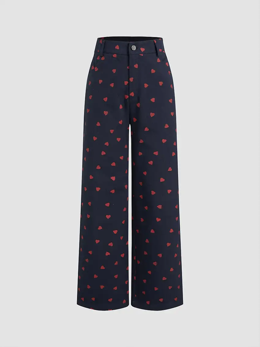 100% Cotton High Rise Heart Graphic Button Straight Leg Trousers