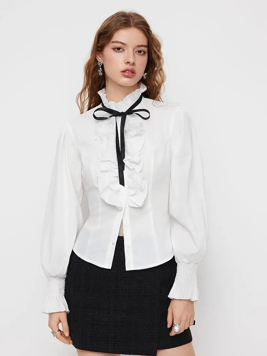• 100% Cotton High Neck Lettuce Trim Shirred Bowknot Long Sleeve Blouse