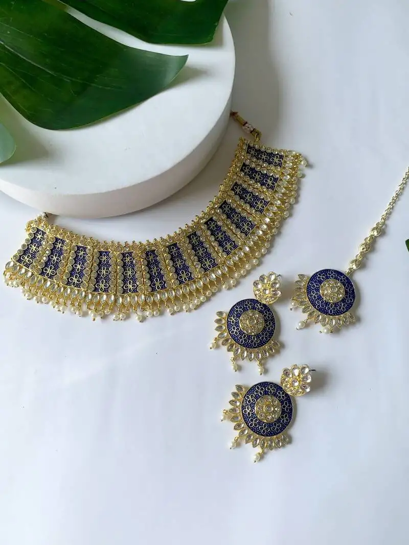 • Traditional stone studded meenakari choker necklace jewellery with earrings & maang tikka set