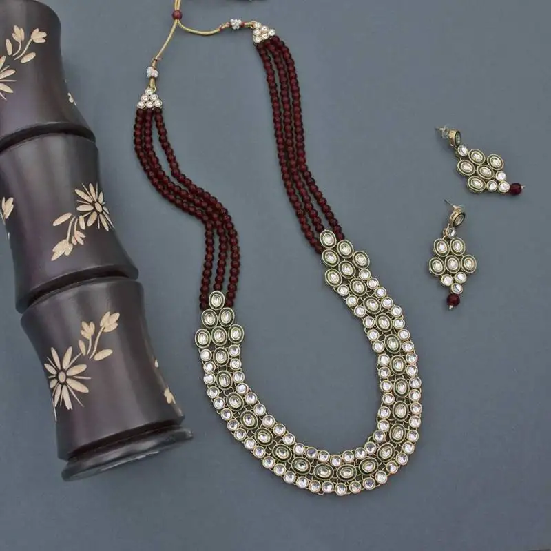 • Traditional stunning maroon meenakari kundan studded pearl necklace jewellery set