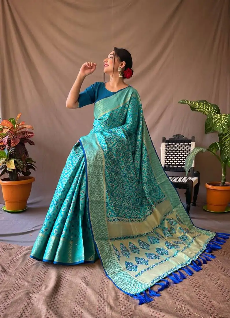 Aqua blue woven patola silk blend saree with blouse piece