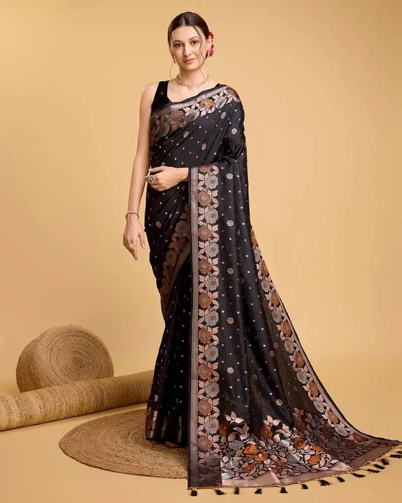 Black woven faux banarasi zari silk saree with blouse piece