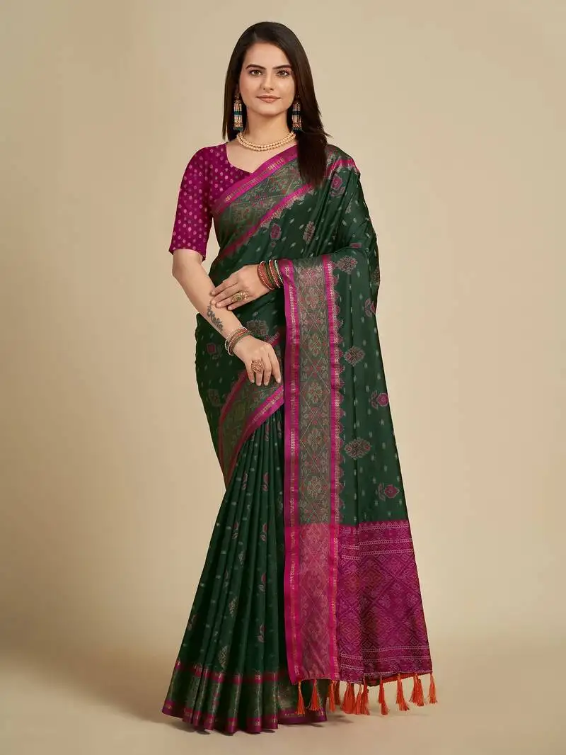 Dark green woven patola silk blend saree with blouse piece