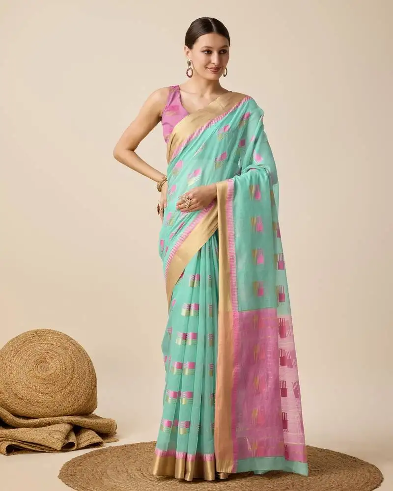 Aqua blue woven kota doria cotton silk saree with blouse piece