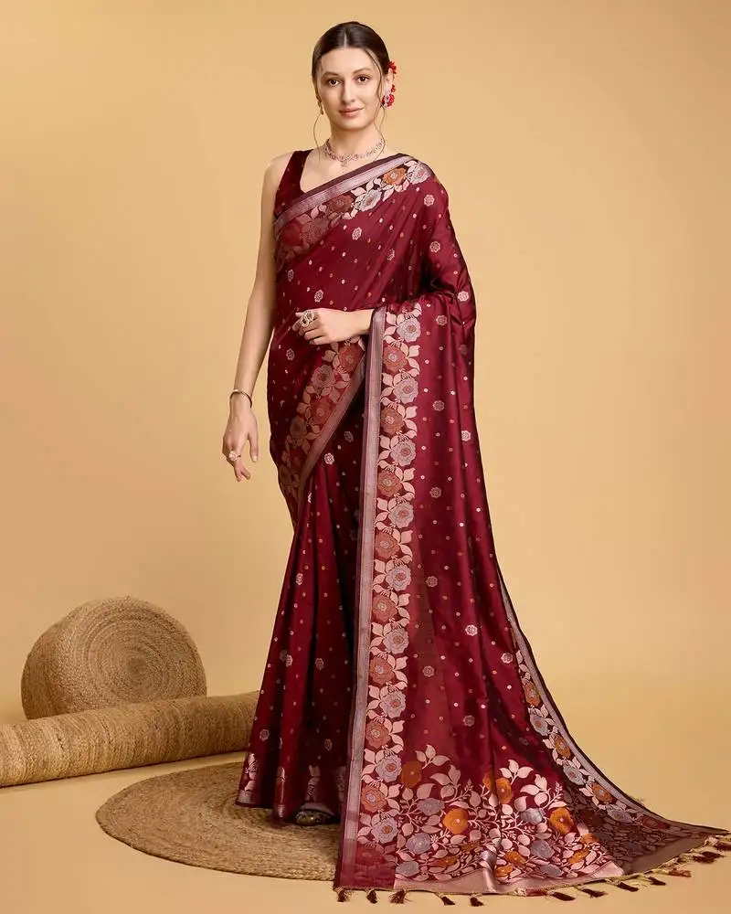 Sale!Maroon woven faux banarasi zari silk saree with blouse piece