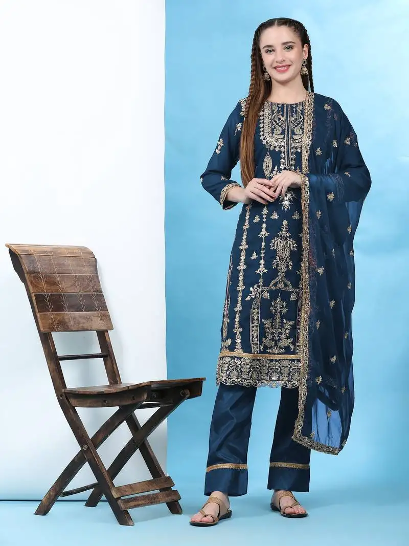 • Blue floral embroidered with sequins georgette semi salwar suit semi stitched