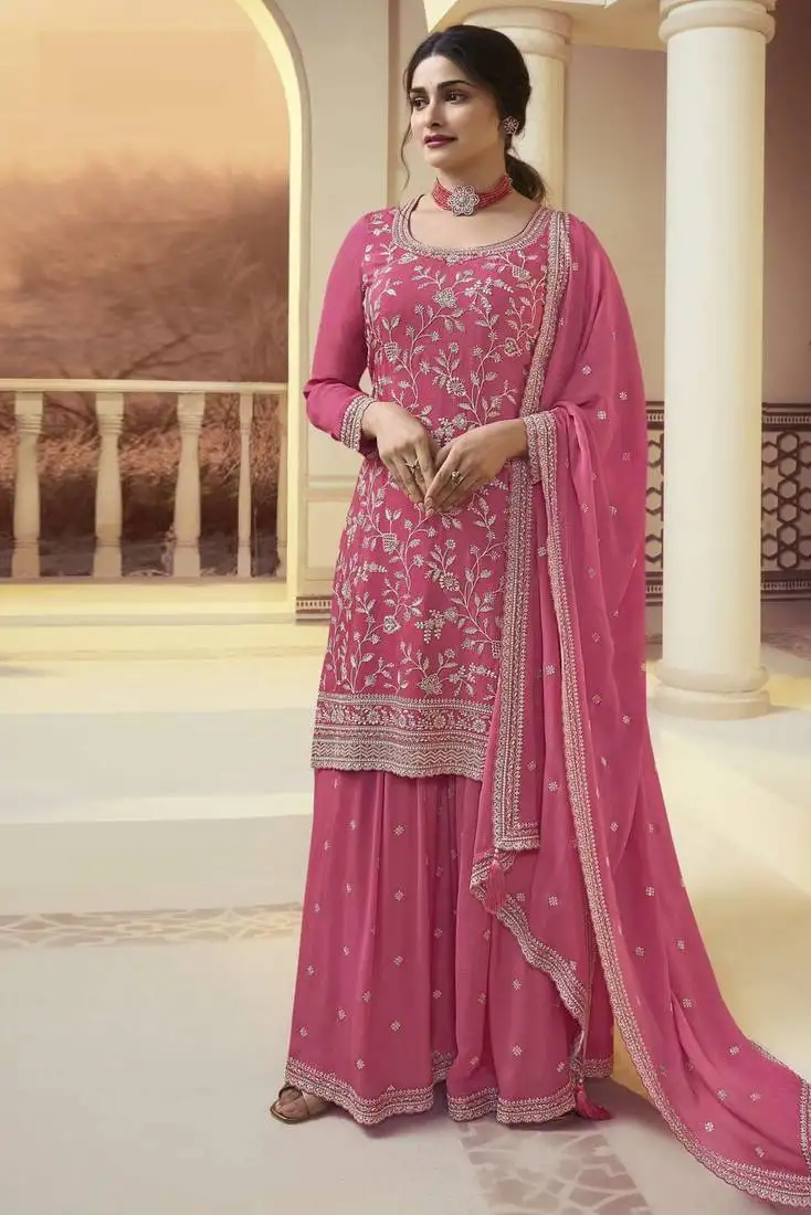 Pink embroidered chinon semi palazzo salwar suit semi stitched