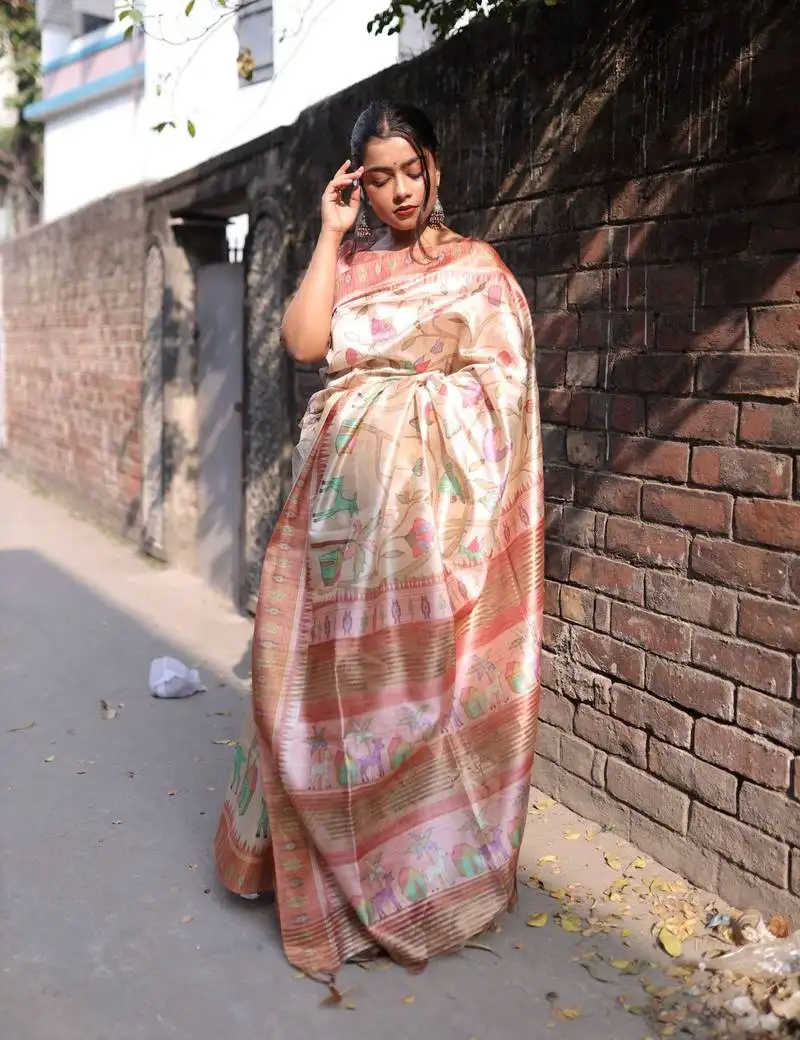 Peach soft tussar silk printed saree festive wear