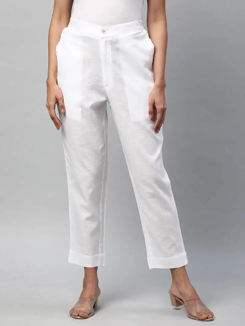 Sale!A white ankle length coton linen pant with plain belt in front.