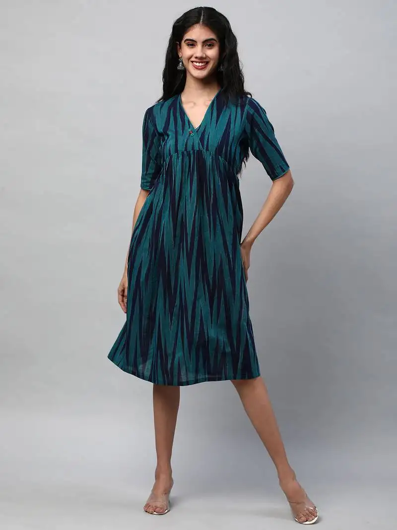 Sale!A-line blue cotton printed dress with pocket.