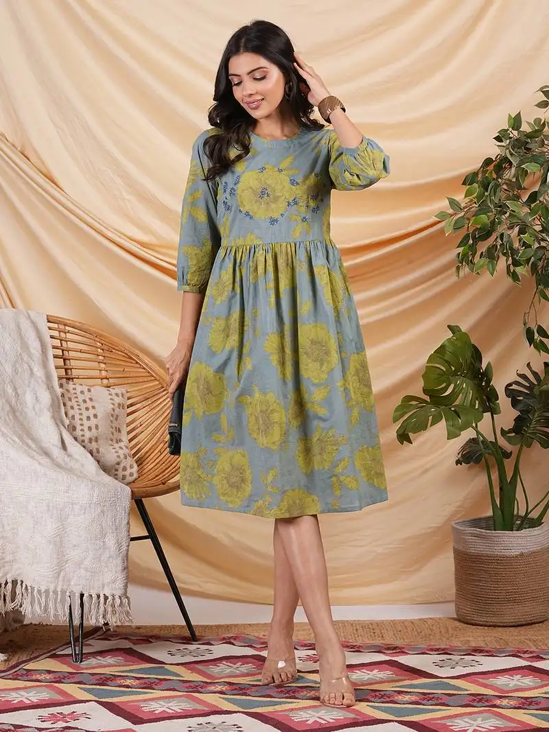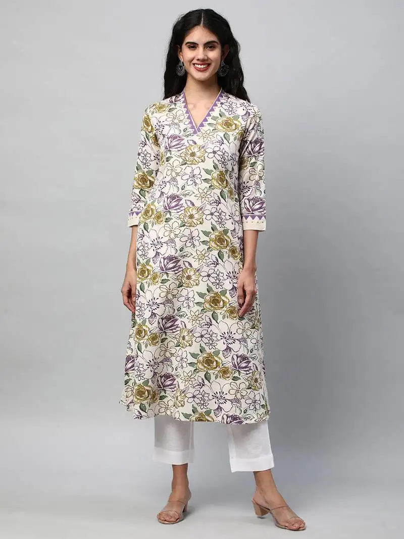 • Printed a-line kurta with block print detail on neck and sleeve.