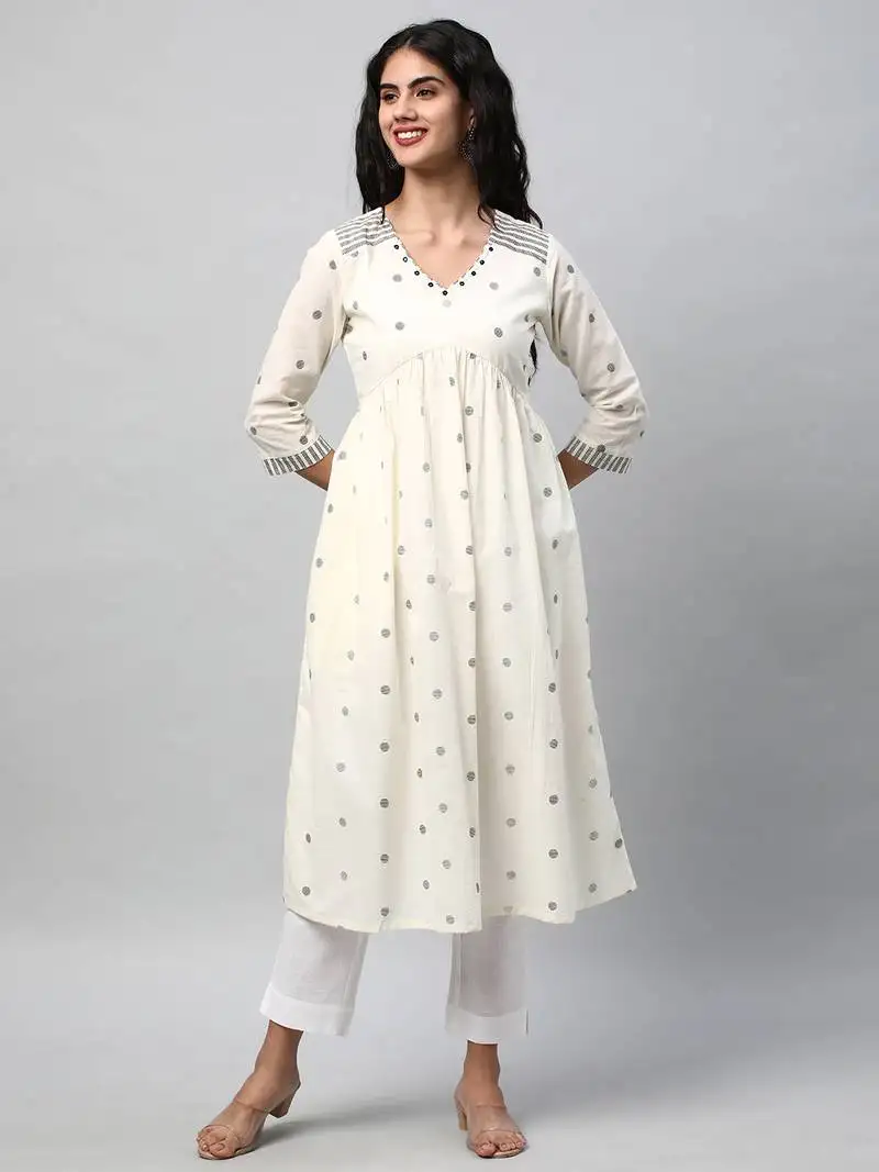 Flared kurta in cotton jamdani print with mirrorwork embellishment.