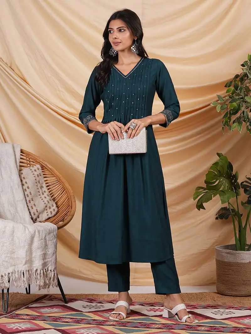 Pleated silk blend kurta with zari embroidery and sequin work.