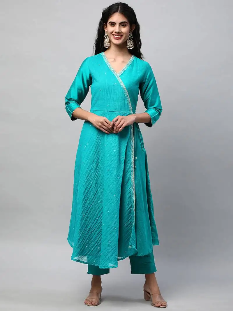 Sale!Silk blend kurta with embroidered lace and tassels detail(blue).