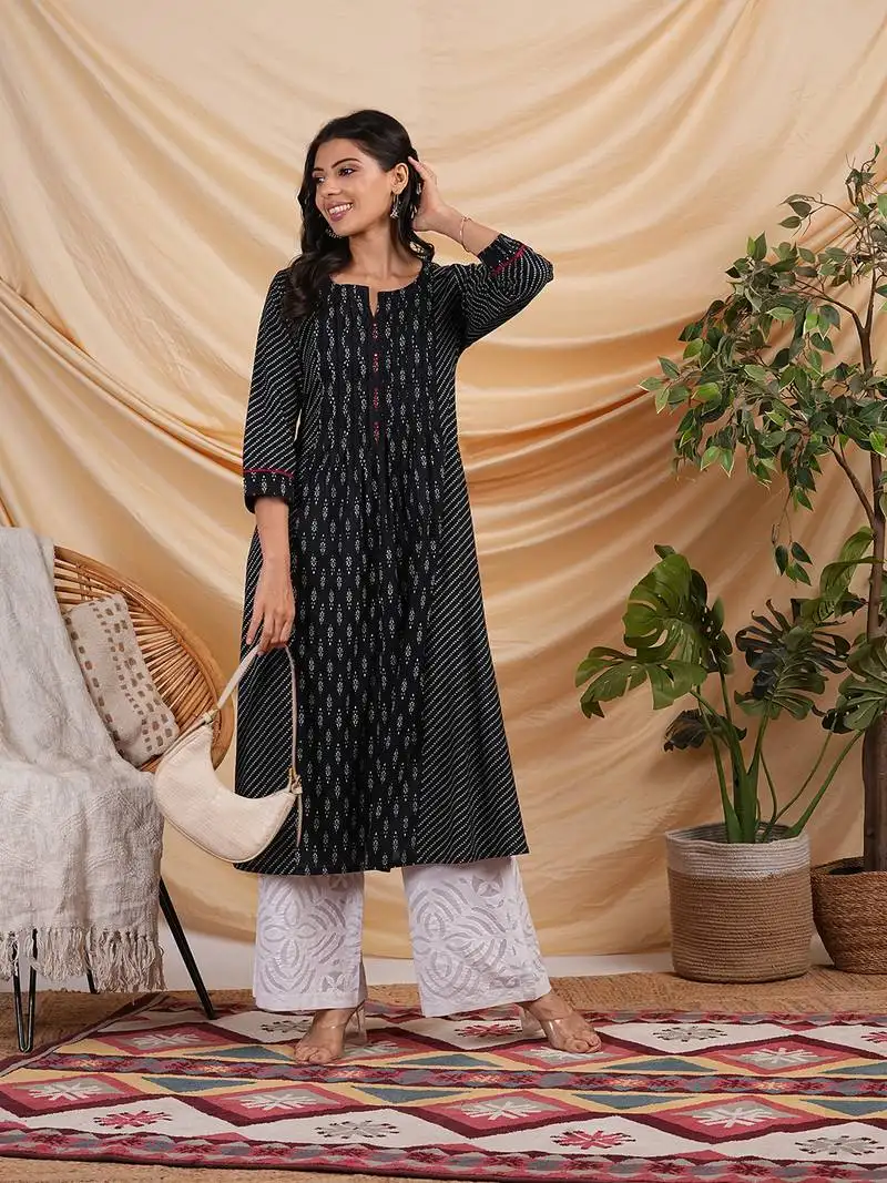 Sale!Printed cotton kurta with a blend of two different prints with pleat & hand embroidery.