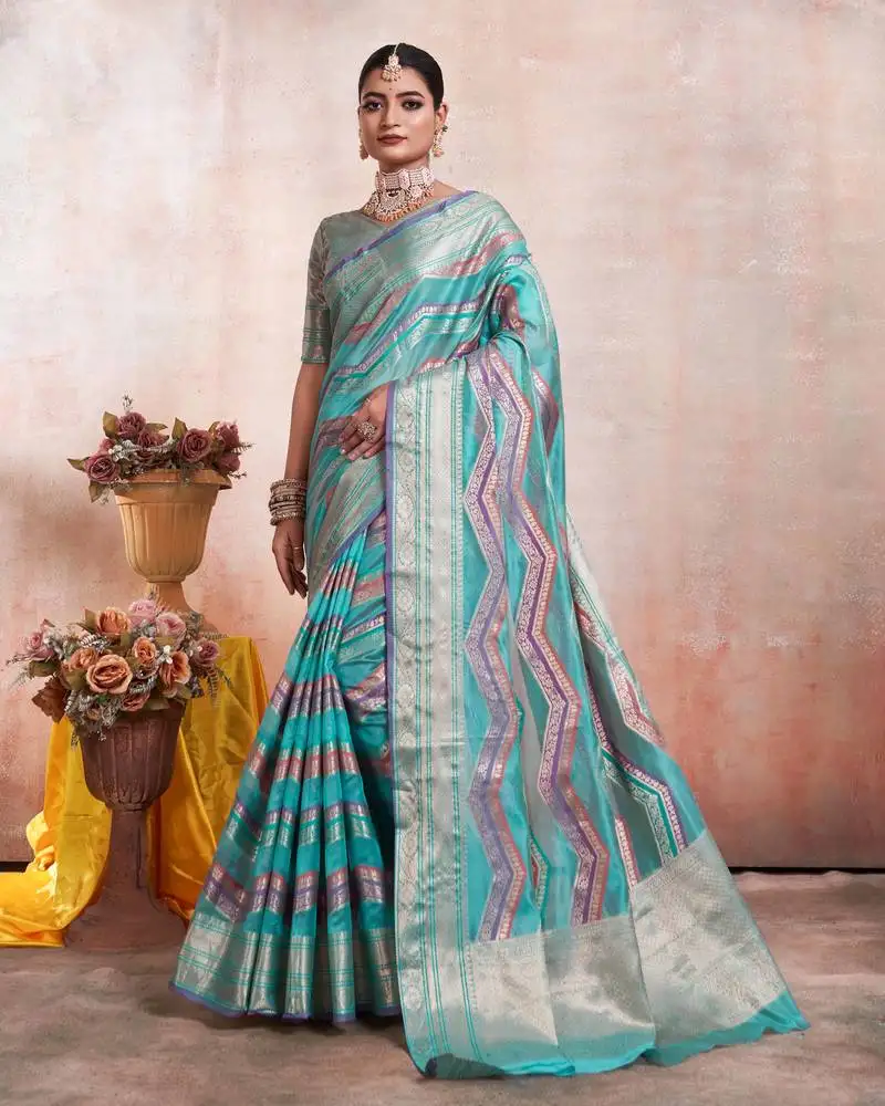 • Sky blue organza faux kanjeevaram woven saree with unstitched blouse piece