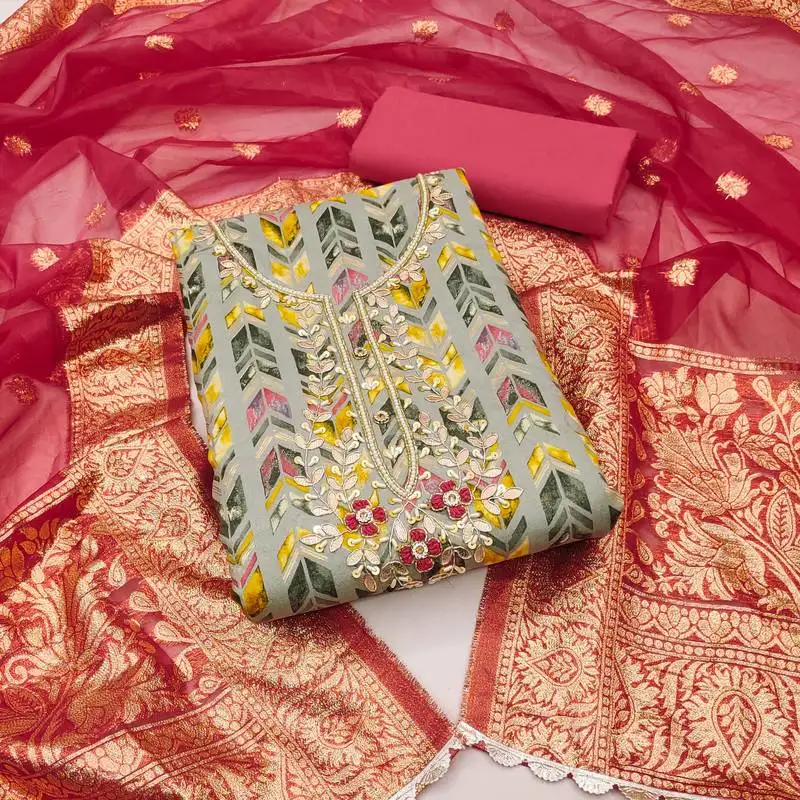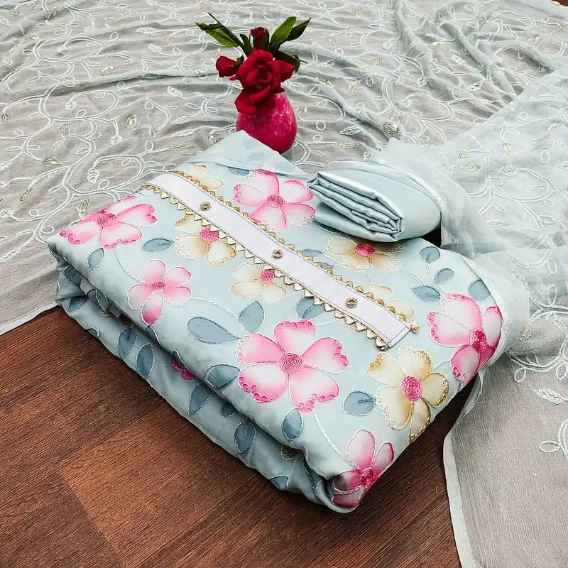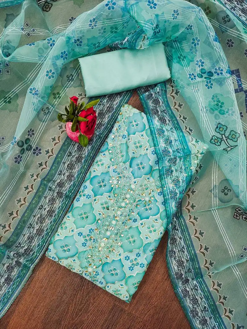 • Sky blue organza embellished unstitched dress material