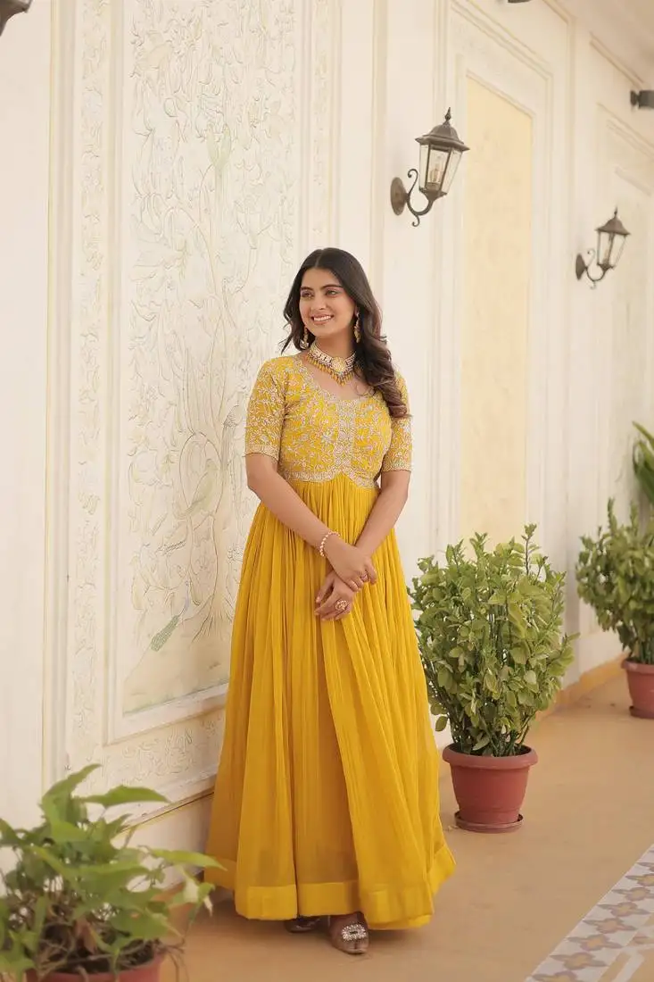 Yellow colour heavy sequins work partywear gown for bridesmaid