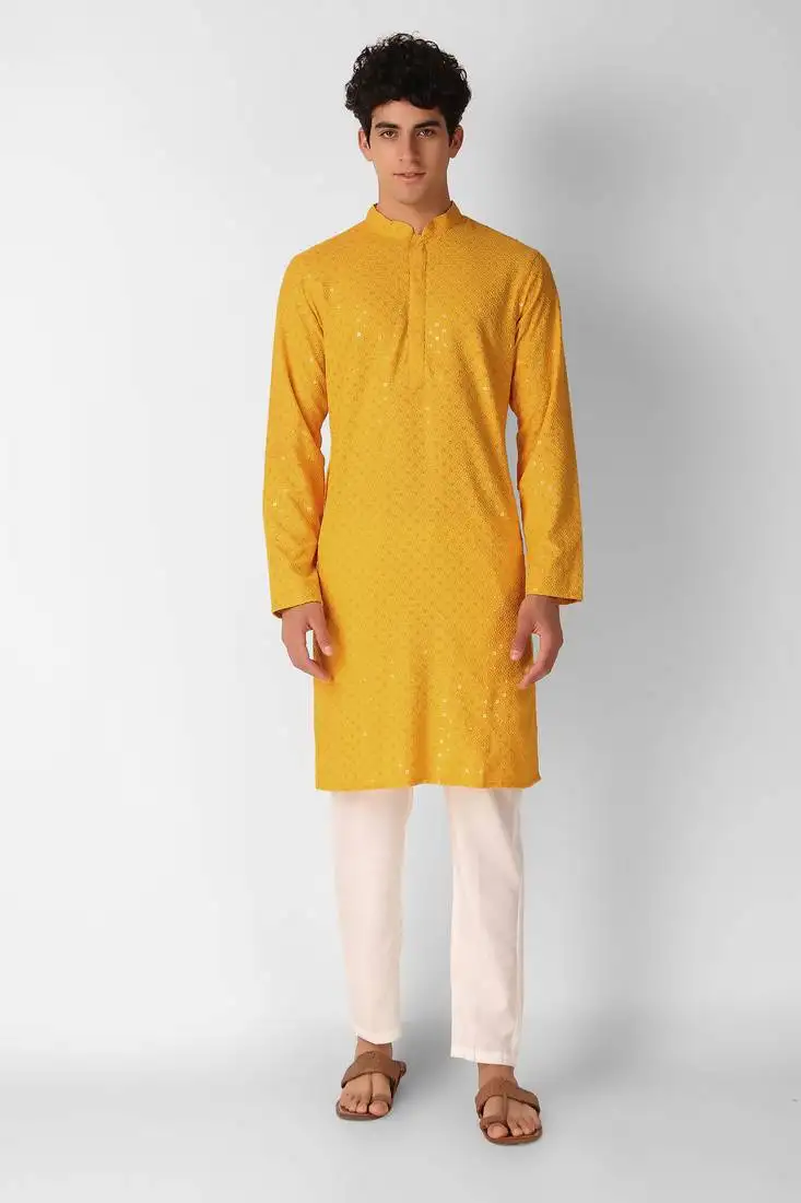 • Yellow colour ethnic trending sequins work cotton fabric kurta for men