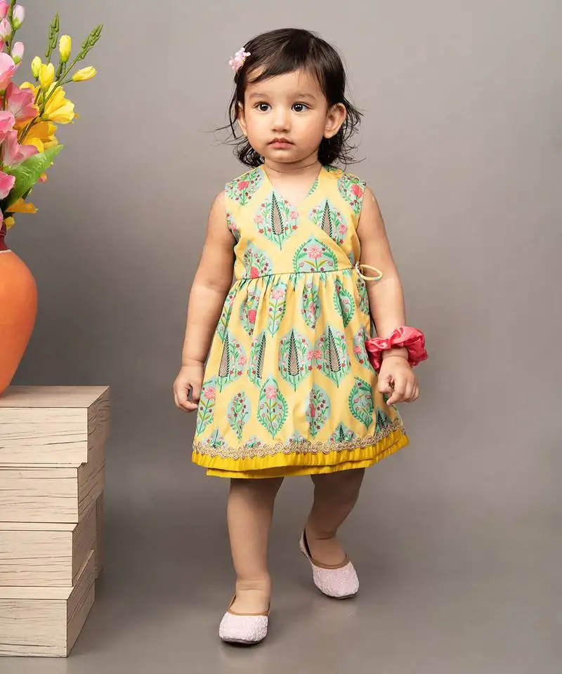 Sale!Yellow crepe printed floral overlap dress