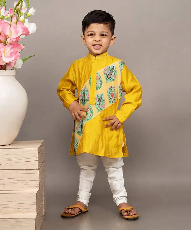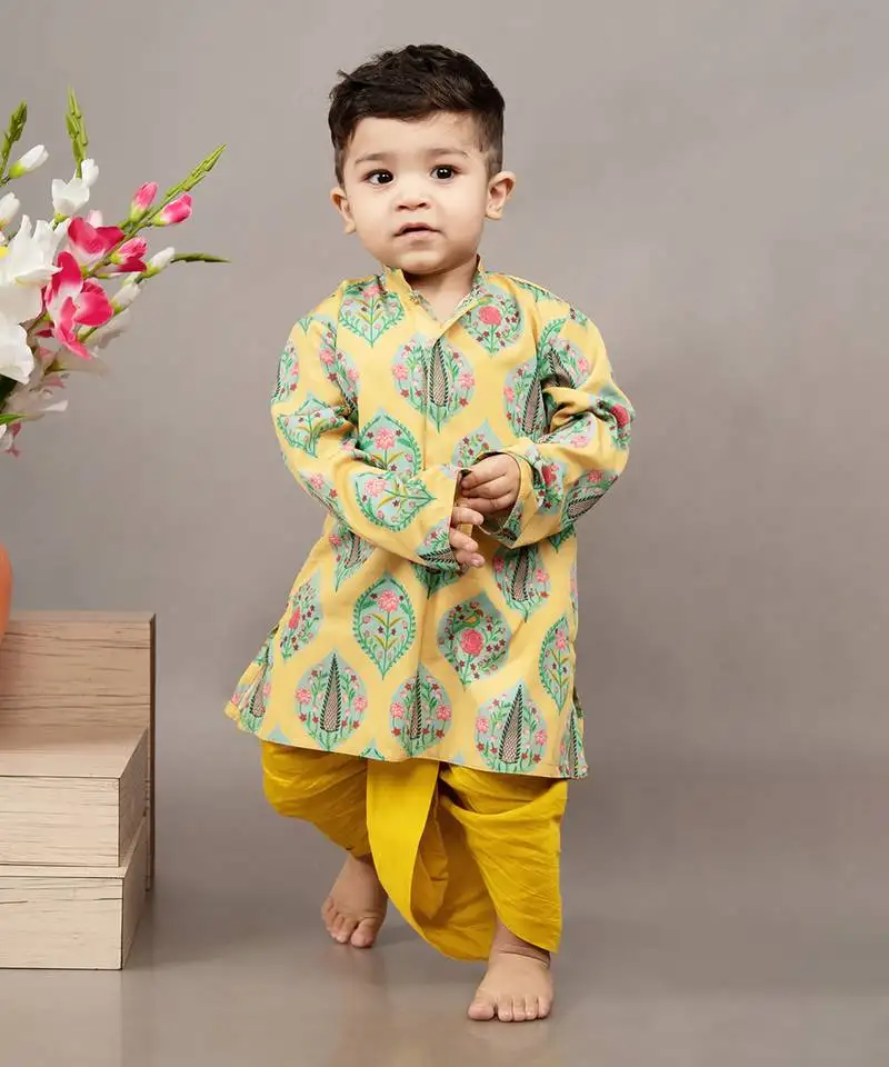 Sale!Mustard yellow silk printed floral kurta and dhoti set