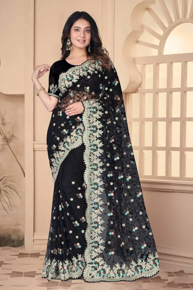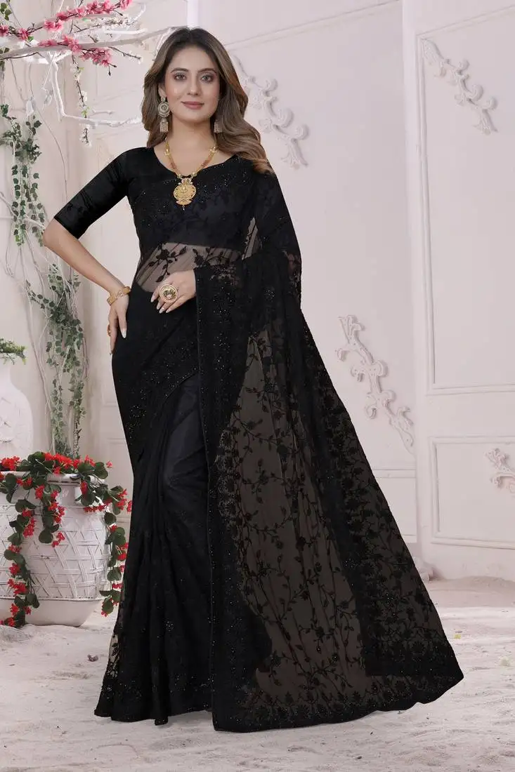 Black sequin zari resham stone embroidered border net party wear saree with matching blouse piece