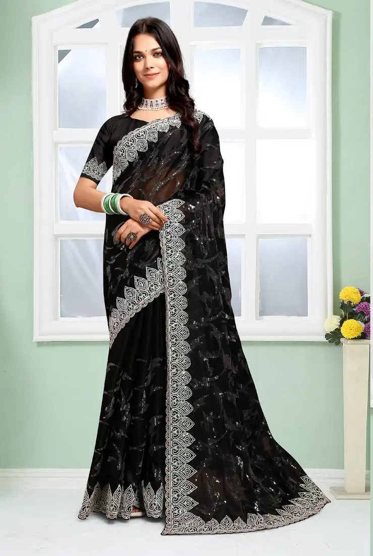 Black sequin zari coding embroidered border organza silk saree with blouse piece