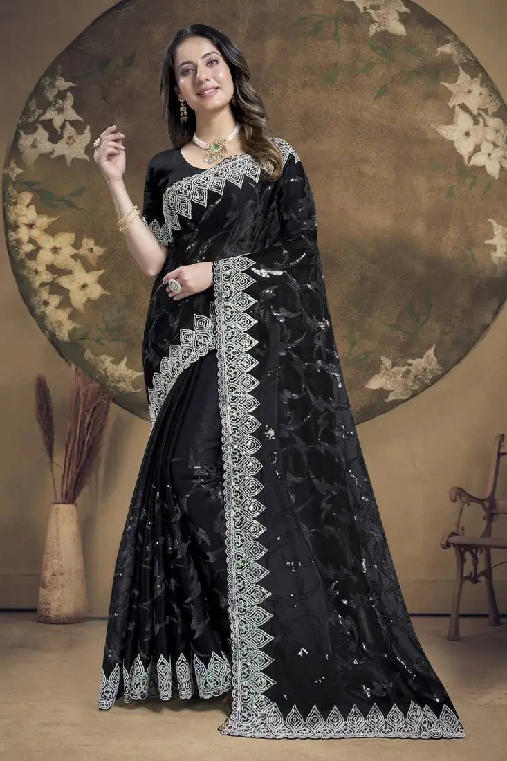 • Black sequin zari resham stone embroidered border net party wear saree with matching blouse piece