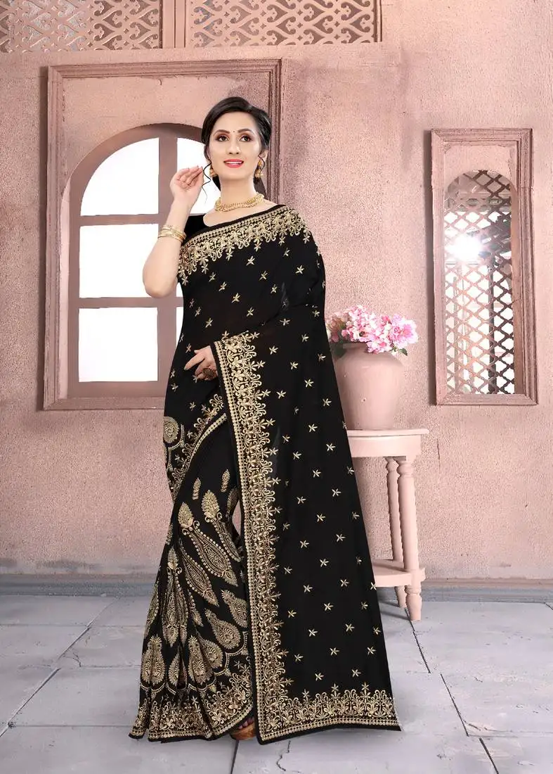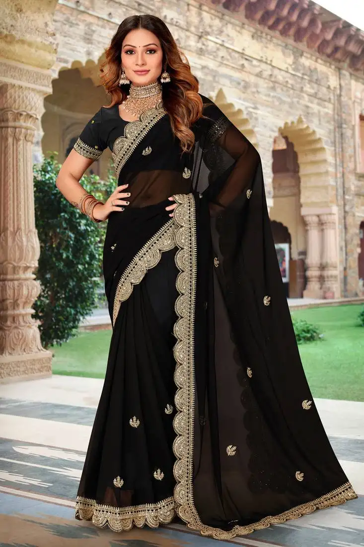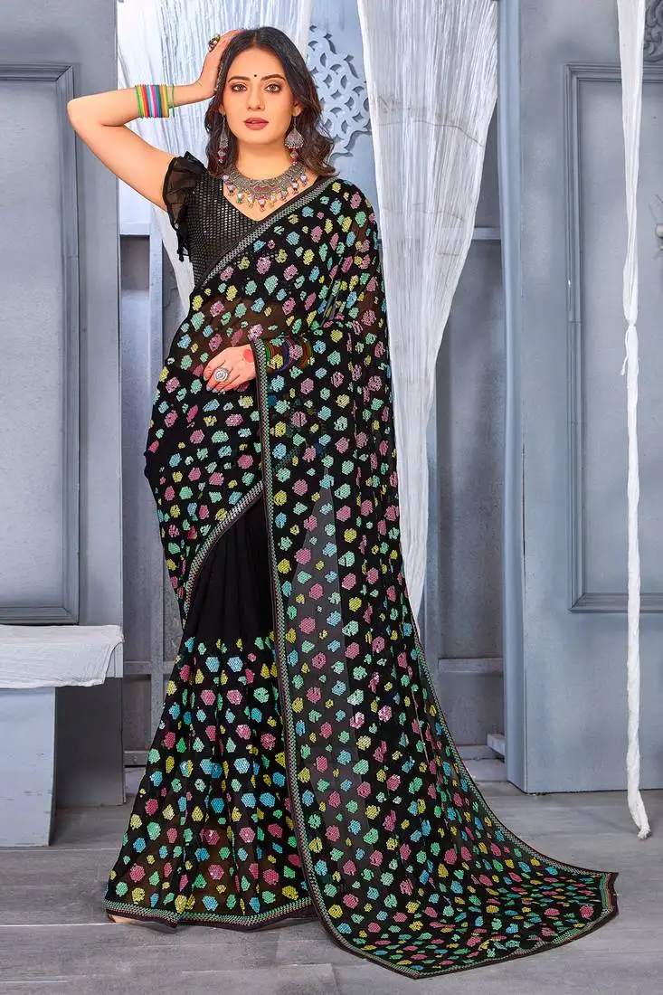 • Black sequence embroidered georgette party wear saree with blouse piece