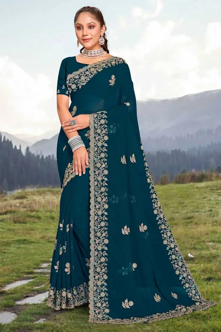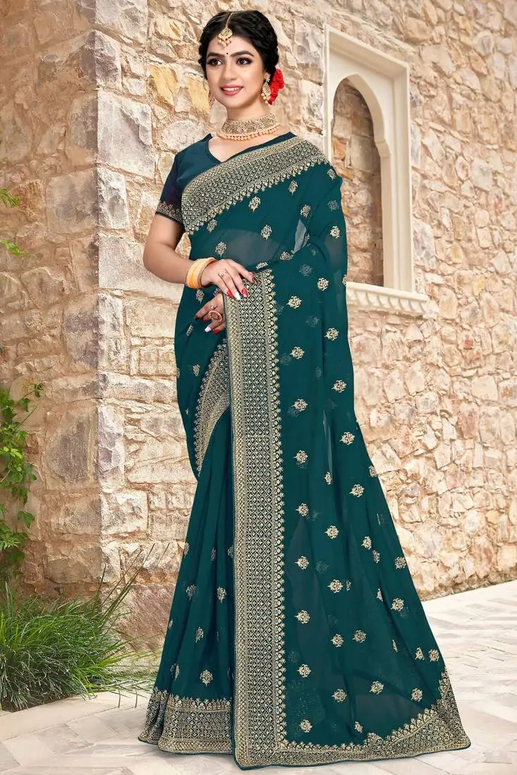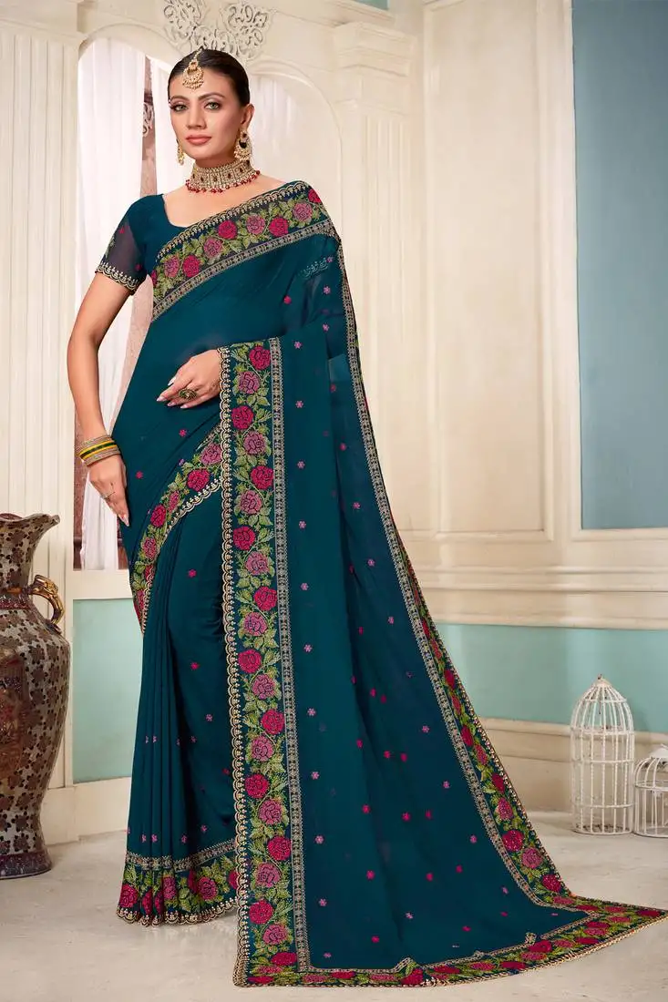 Women’s teal blue zari resham embroidered georgette saree with blouse piece by manu fashion era