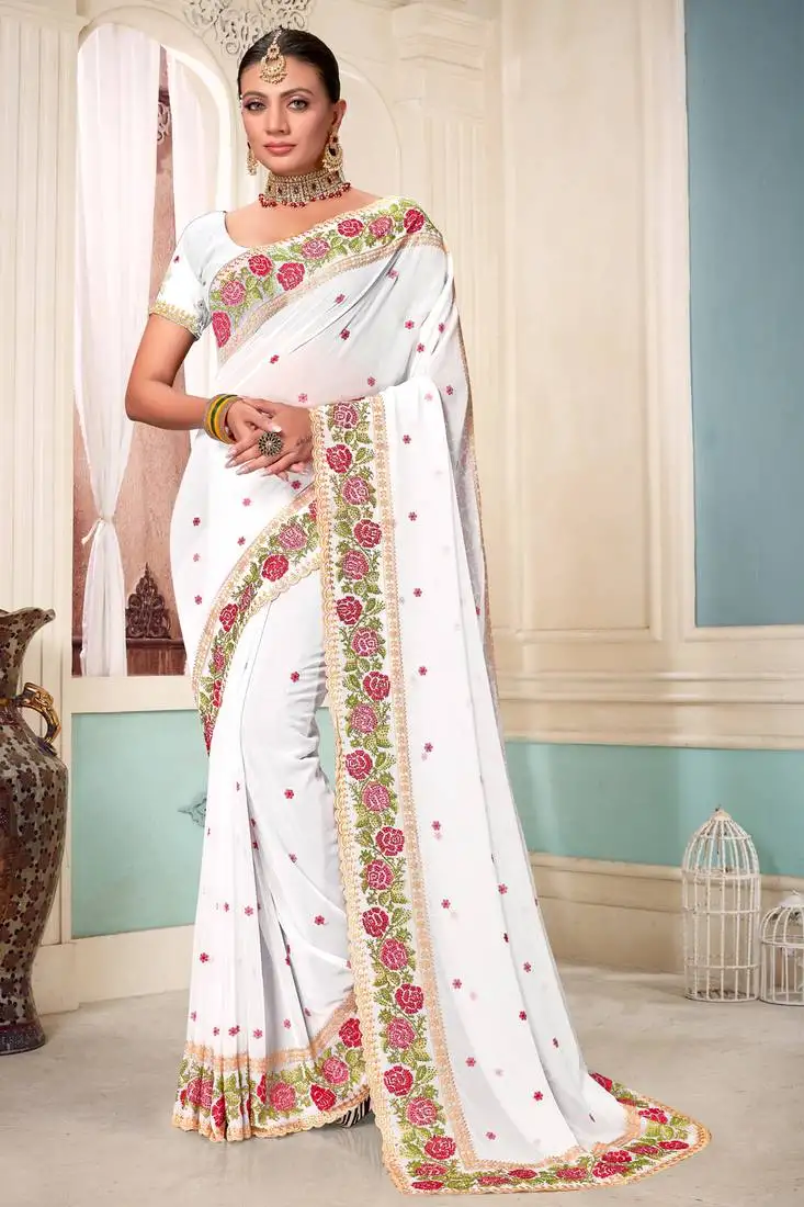 Women’s white resham embroidered georgette saree with blouse piece by manu fashion era