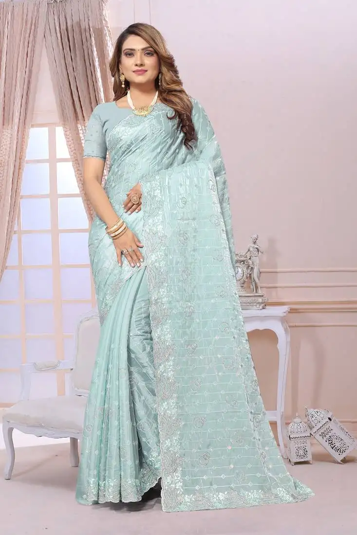 • Women's sky blue zari resham organza silk party wear wedding saree with blouse piece