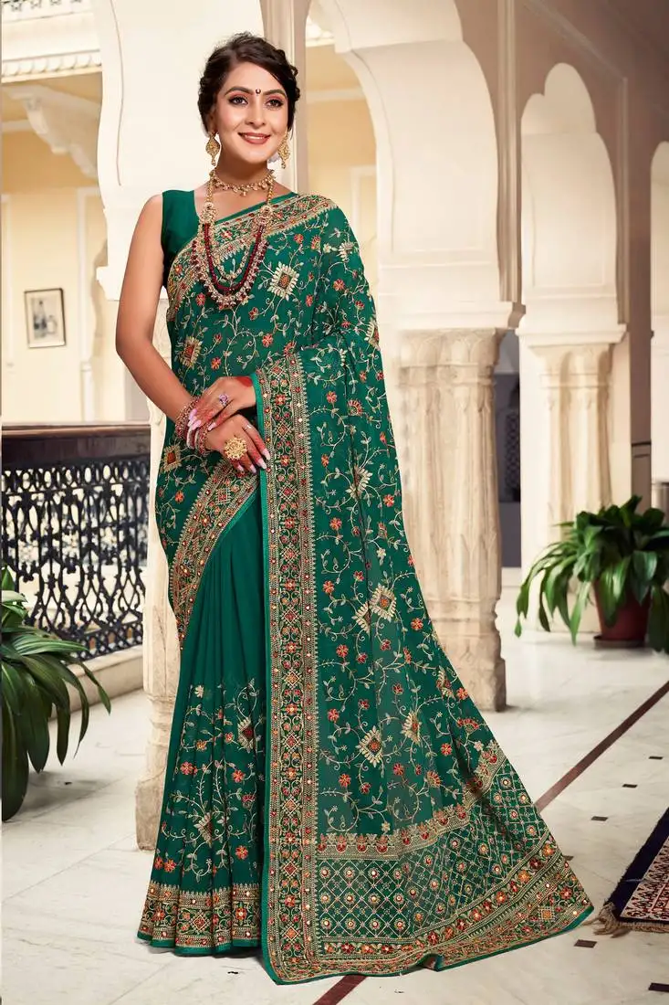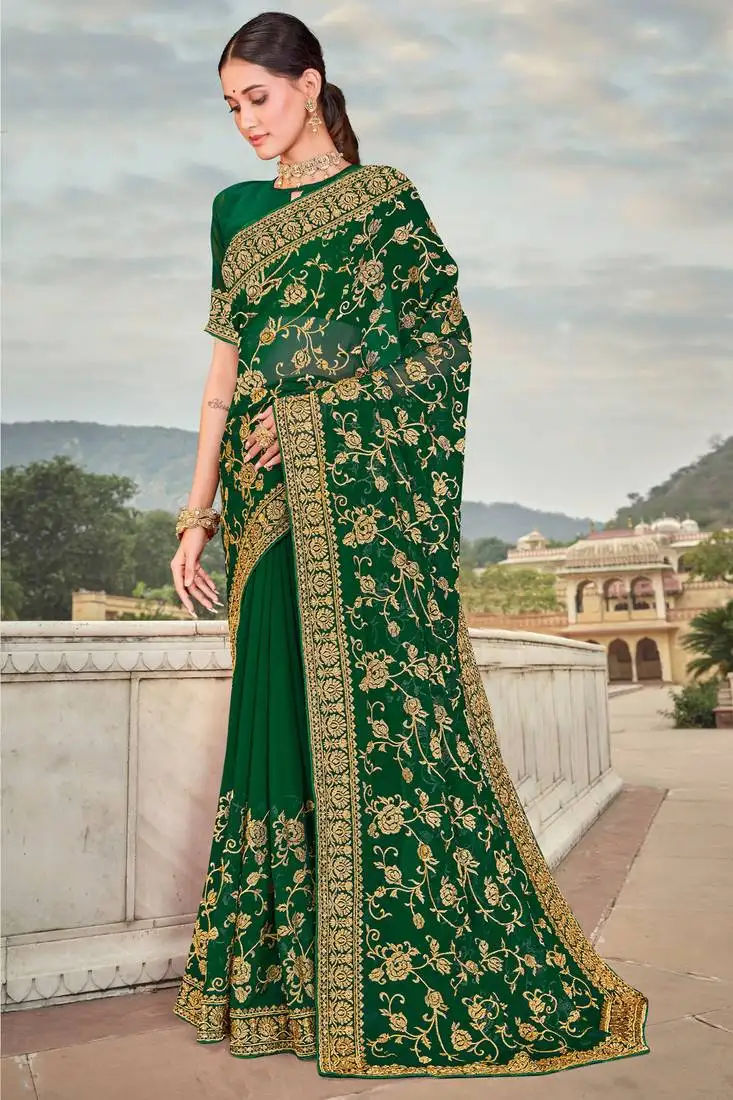 Bottle green zari embroidered stone border georgette party wear saree with blouse piece