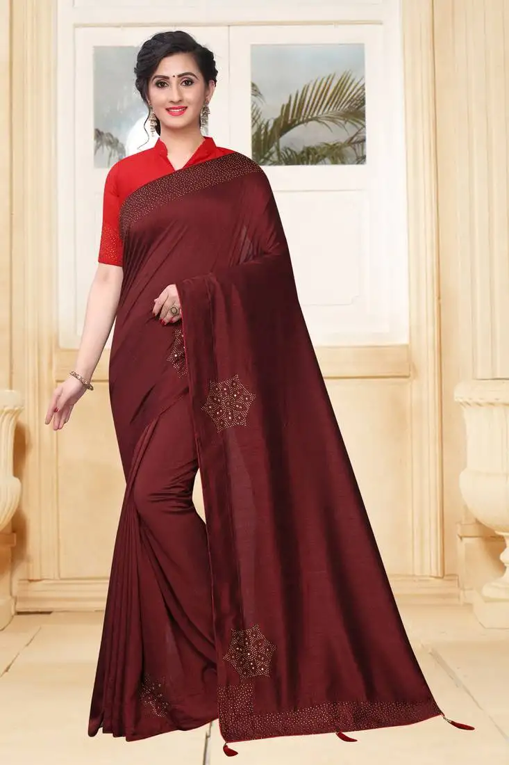 Brown siroski stone border two tone silk party wear saree with blouse piece