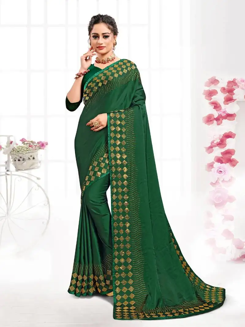 Bottle green siroski stone border satin party wear saree with blouse piece