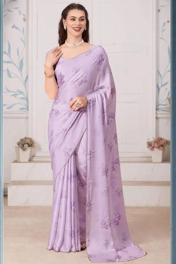 • Digital printed satin georgette saree in purple with matching blouse piece