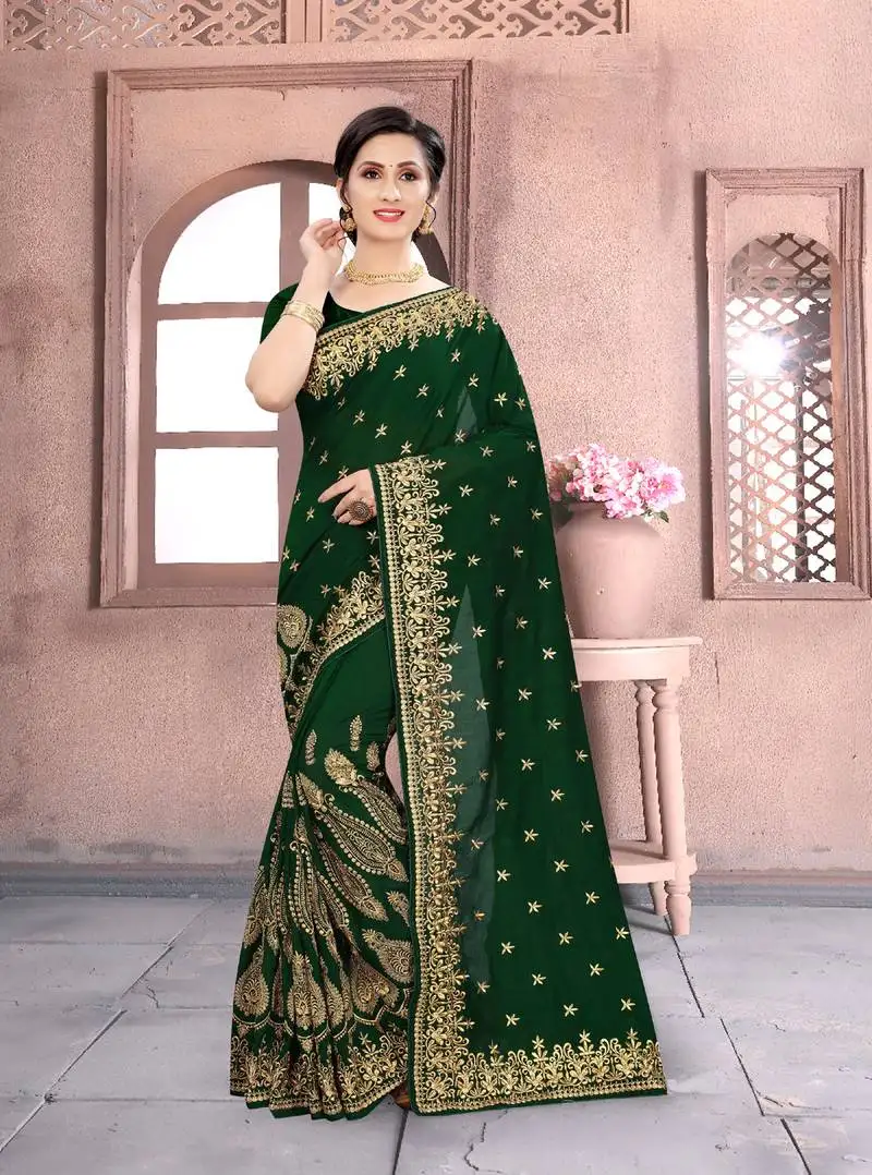 • Bottle green zari embroidered stone border georgette party wear saree with blouse piece