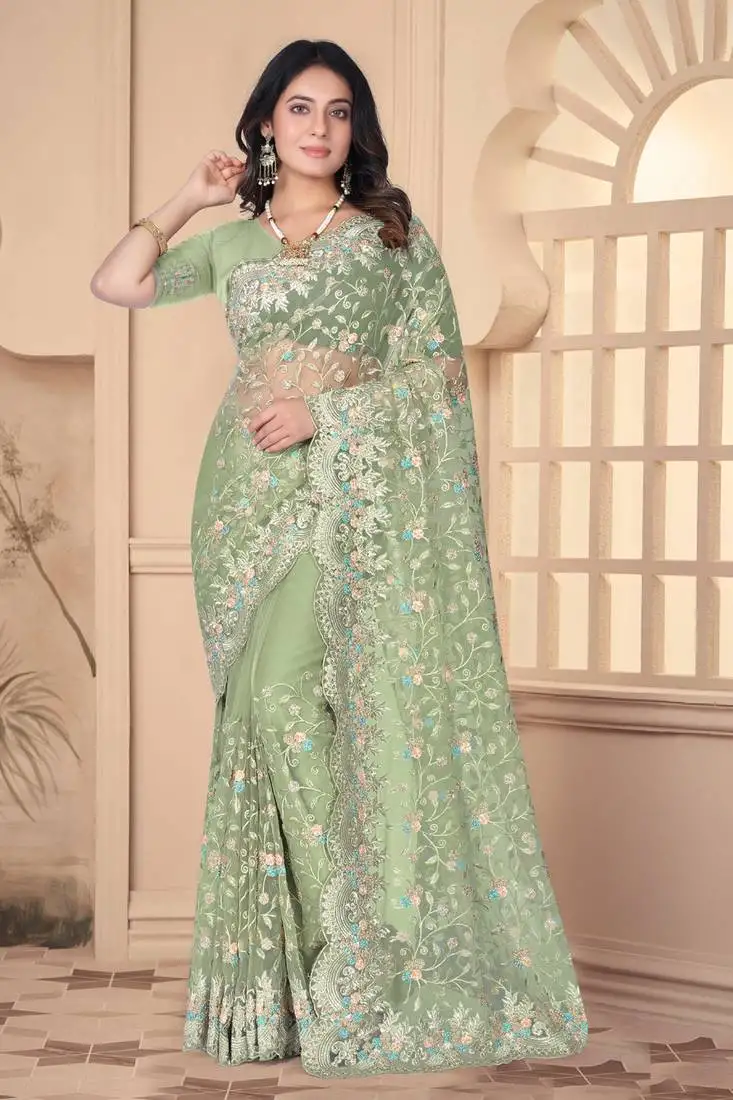 Green sequin zari resham stone embroidered border net party wear saree with matching blouse piece