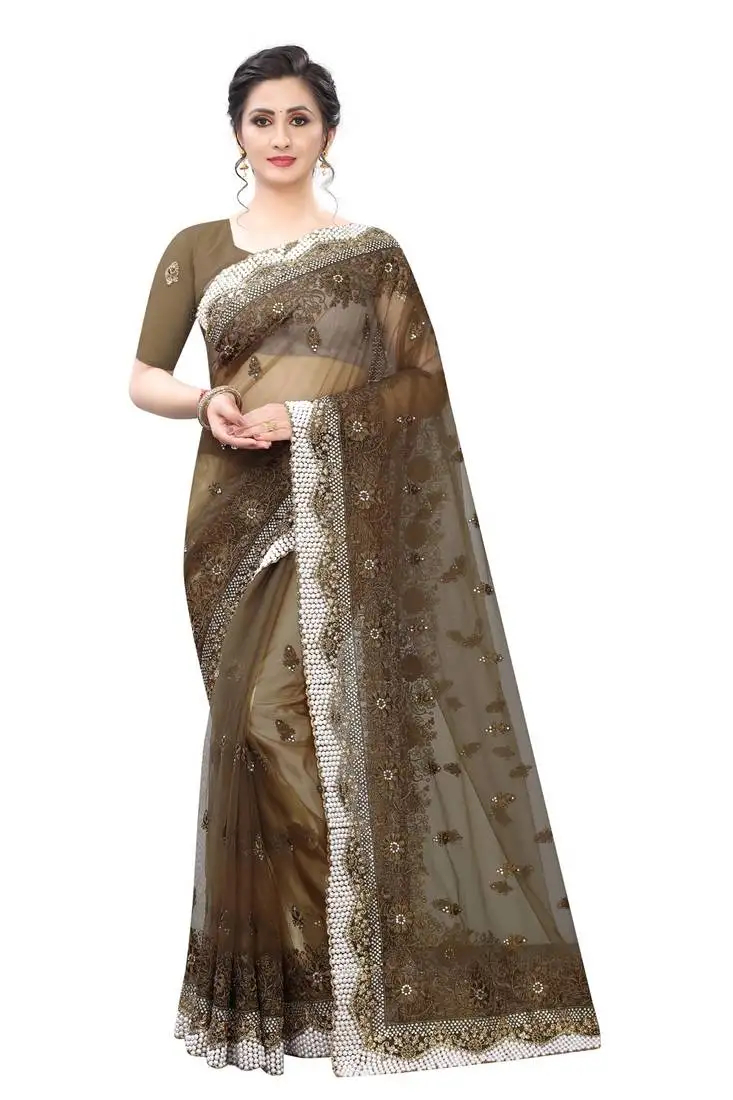 Brown zari resham moti stone embroidered net party wear saree with blouse piece