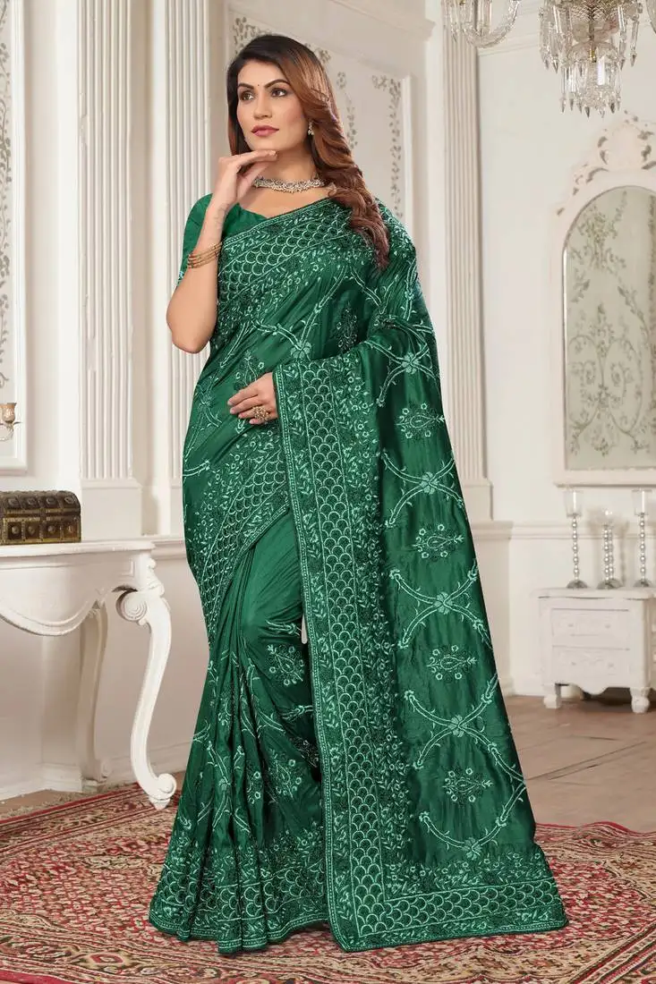 Bottle green sequin zari resham embroidered vichitra silk party wear saree with matching blouse piece