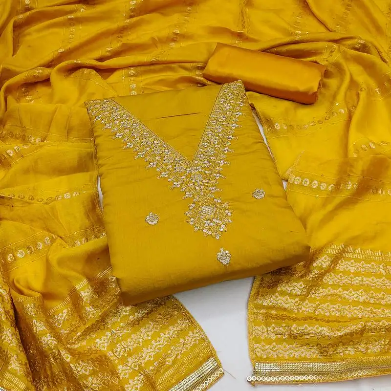 Women’s yellow unstitched hand work modal cotton jacquard dress material