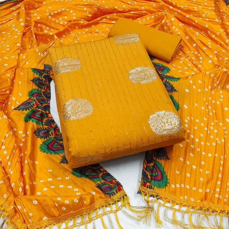 • Women's yellow unstitched mirror work cotton jacquard dress material