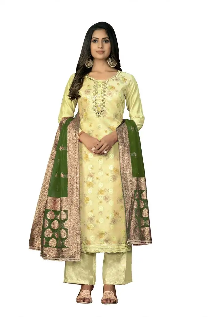 • Women's yellow unstitched handwork simmar banarasi jacquard dress material