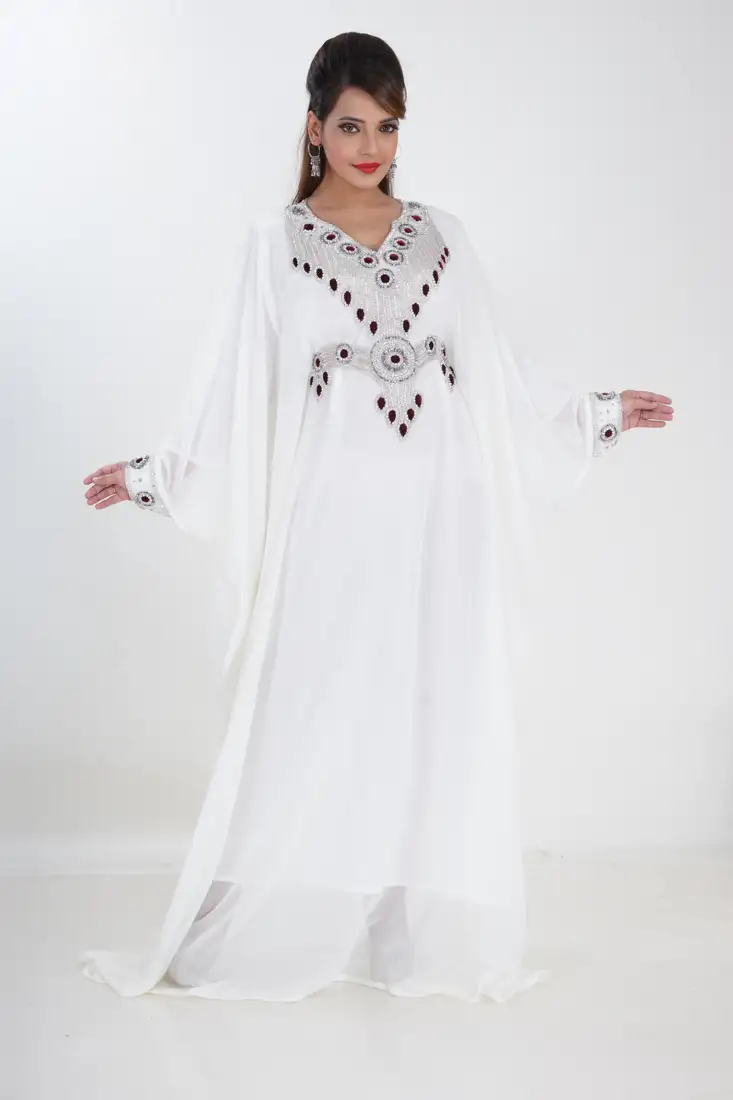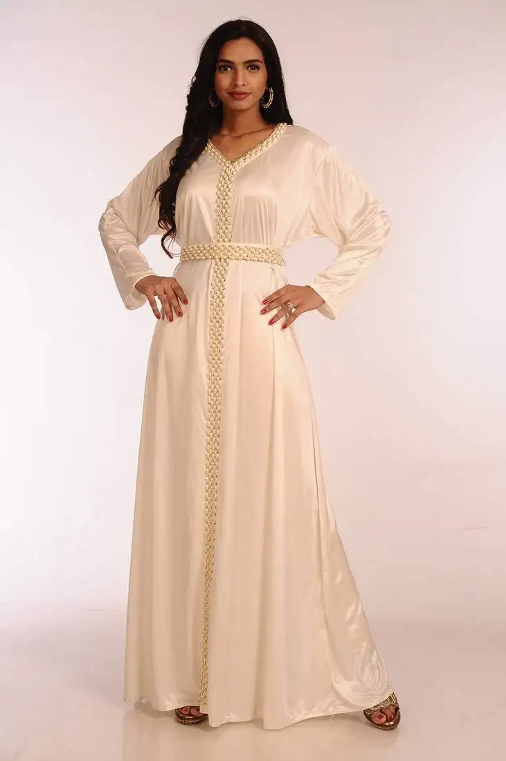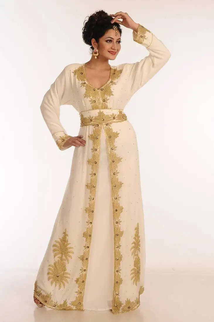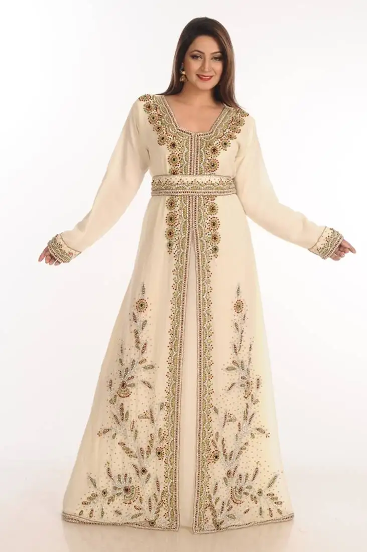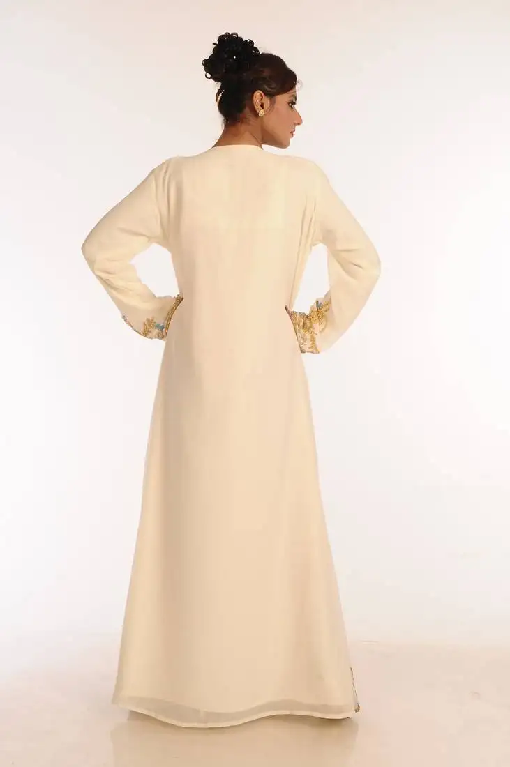 Cream zari work georgette islamic style party wear stones and beads embedded arabian kaftan