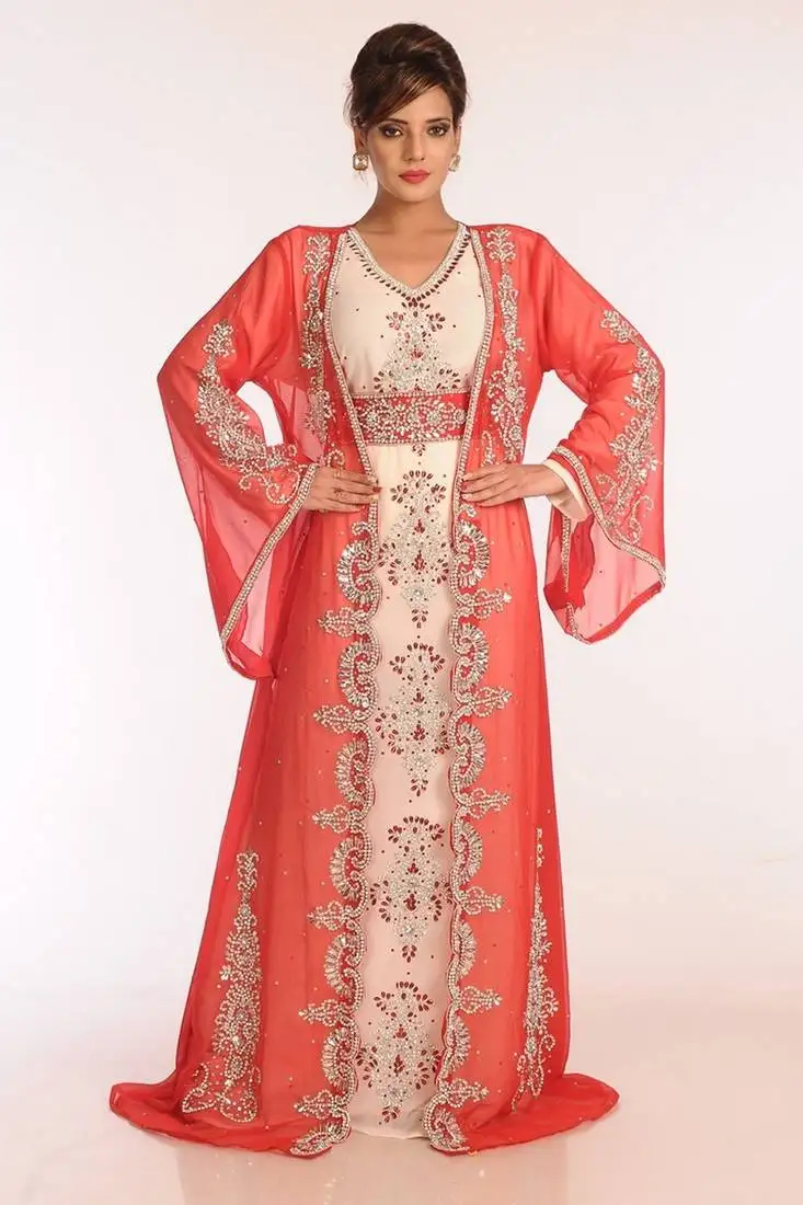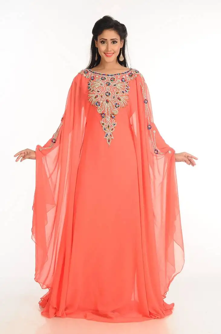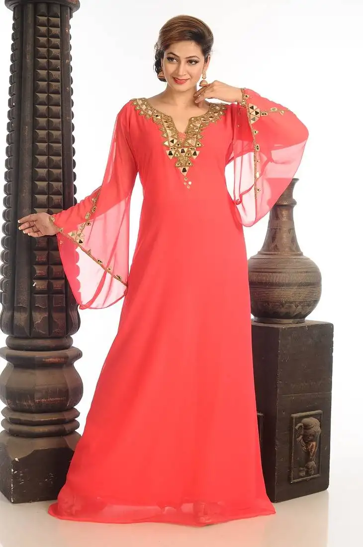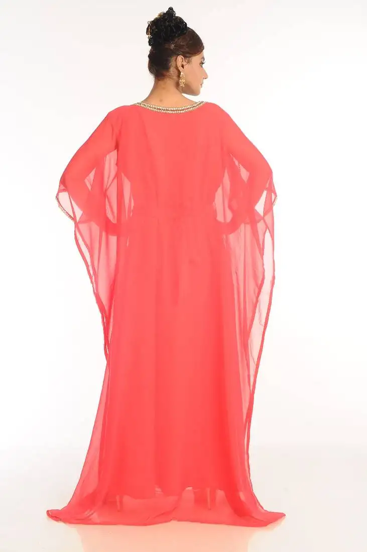 Peach zari work stones & beads embellish georgette islamic style arabian maxi partywear kaftan