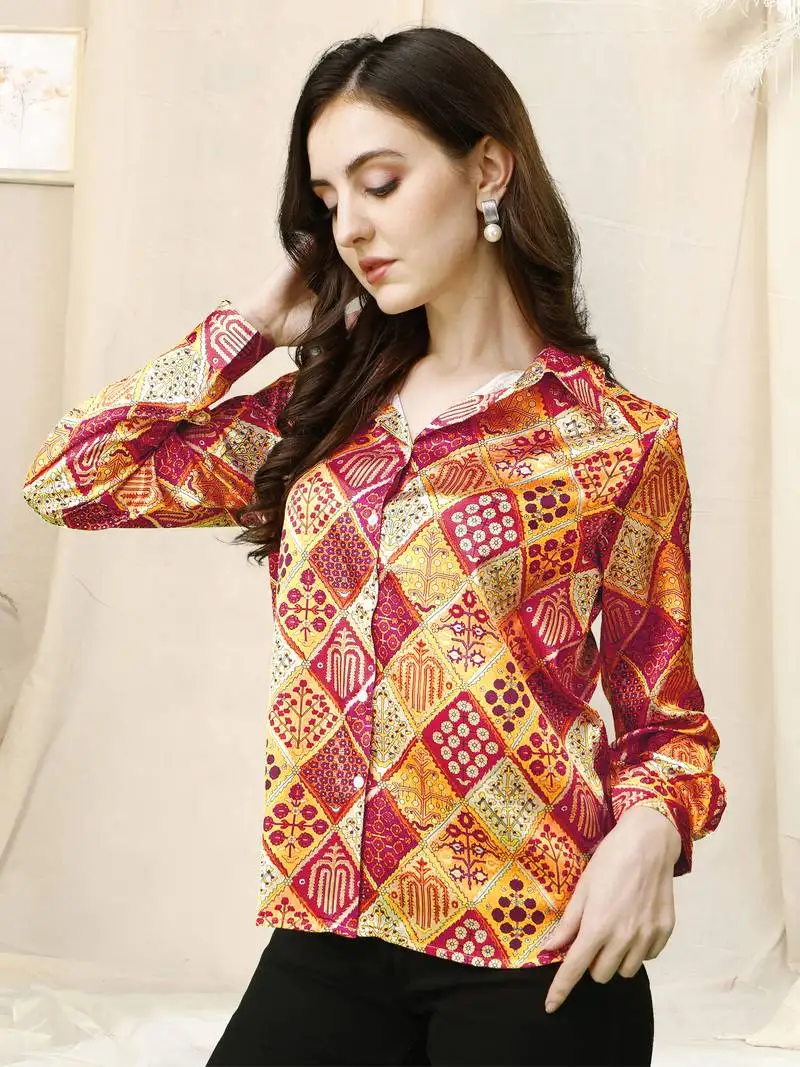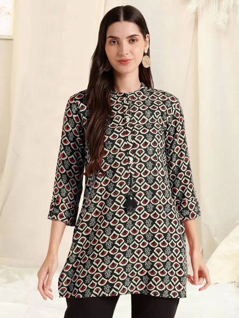 • Black red rayon printed mirror handwork buttons tassles kurta for women